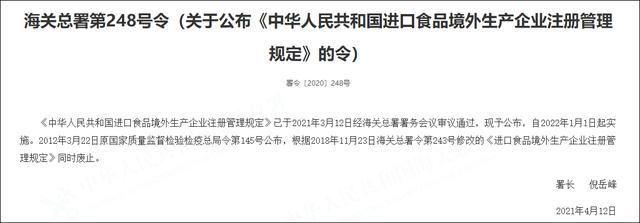 根据海关总署官网发布内容,第248号令明确了所有进口食品境外生产企业必须经海关总署注册、注册实施分类管理(分为“所在国家(地区)主管当局推荐注册”和“企业申请注册”两种方式)。该新规将自2022年1月1日起施行。