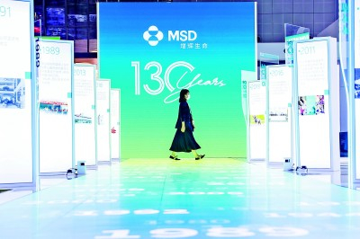 11月7日,参观者走过医疗器械及医药保健展区的默沙东展台。新华社发