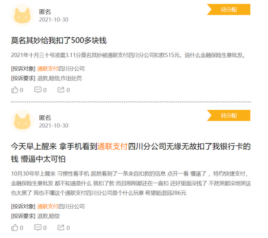 此外,通联支付的代收业务或不合规。黑猫投诉网显示,关于通联支付的投诉量一共2049条,大部分用户反映遭通联支付莫名扣款。多名用户表示,未在通联支付公司办理业务,却在不知情的情况下,被通联支付以金融保险等名义,从银行卡中扣走了钱。