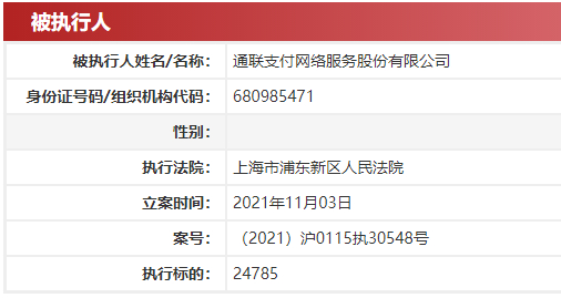 日前,中国执行信息公开网显示,持牌第三方支付机构通联支付网络服务股份有限公司(下称“通联支付”)产生被执行信息,执行法院为上海市浦东新区人民法院,执行标的为24785元。
