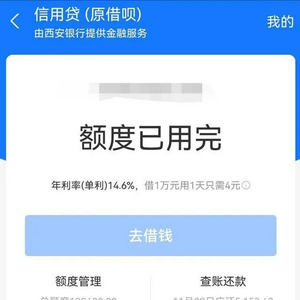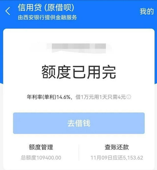 11月7日,有部分网友发现,支付宝的“借呗”名称变为了“信用贷”。产品截图显示,“信用贷”页面会在显著位置展示“由XX银行提供金融服务” 的信息。进入借款页面后,在“借款详情及协议”中,还可看到日利率、初始年利率、总利息金额等信息。