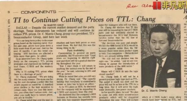 将近50年前,1974年2月,我在德州仪器的时候用过一个策略叫“持续降低TTL的价格”(TI to Continue Cutting Prices on TTL:Chang),看上去凶哈哈的样子。事实上,这个策略非常成功。为什么?当时TTL(Transistor-Transistor-Logic,晶体管-晶体管逻辑电路 ) 是一种非常受欢迎的商品。