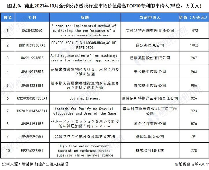 全球反渗透膜市场价值最高TOP10专利中,市场价值最高的专利是“CA2842206C:A computer-implemented method of monitoring the performance of a reverse osmosis membrane”,申请人为艾可华特系统有限责任公司,专利市场价值达到1072万美元。