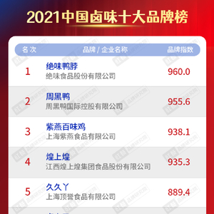 其中,2021中国卤味十大品牌揭晓,绝味鸭脖、周黑鸭、紫燕百味鸡、煌上煌、久久丫、卤人甲、廖记棒棒鸡、留夫鸭、盛香亭新式热卤、降龙爪爪等品牌斩获殊荣。
