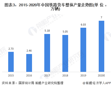 2015-2020年,我国铁路货车整体产量呈现波动上涨的趋势。2019年,我国铁路货车整体产量为6.03万辆,2018年同比上升16.09%。经过初步估算,2020年铁路货车整体产量或将达到7.00万辆。