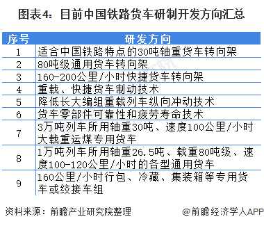 目前,中国铁路货车主要研发方向如下,中国正在开展铁路重载、快捷货车设计、制造、安全检测、运用维护和检修、技术管理等标准研究;并目标全面掌握重载货车的设计、制造技术,满足高附加值货物快捷运输的需求,以期实现货车重载、快捷技术的新跨越、新突破。