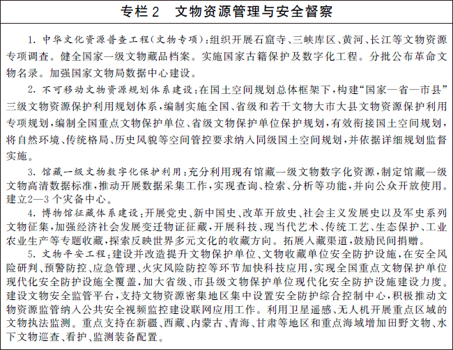 实施文物平安工程,加大古遗址、古墓葬、石窟寺石刻等防盗窃盗掘预警技术研发应用和相关装备配置力度。加强博物馆和文物建筑等火灾防控、洪涝监测预警、地震和地质灾害防控信息技术应用和应急管理体系建设。加强卫星遥感、无人机、大数据等科技手段在文物安全监测和执法督察中的应用。