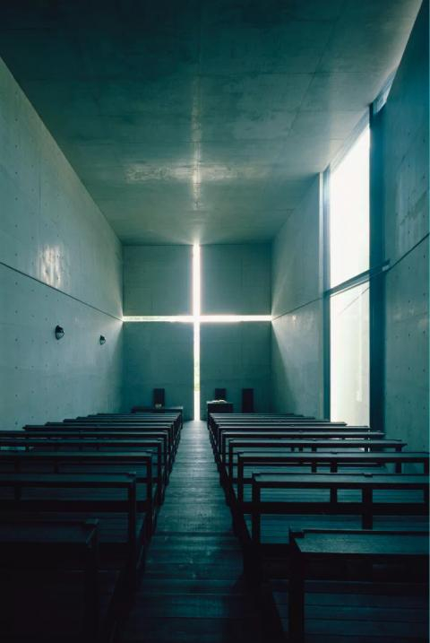 “光之教堂”是一个精简到极致的裸露空间,杜绝了任何的装饰性元素,仅在礼拜堂正面的墙壁上留下一个十字形的开口,将象征教堂的“十字”投射到这个幽暗的空间中——光之教堂跃然而出。由此成为无数人内心与自己对话的最神圣的“朝圣地”。