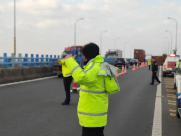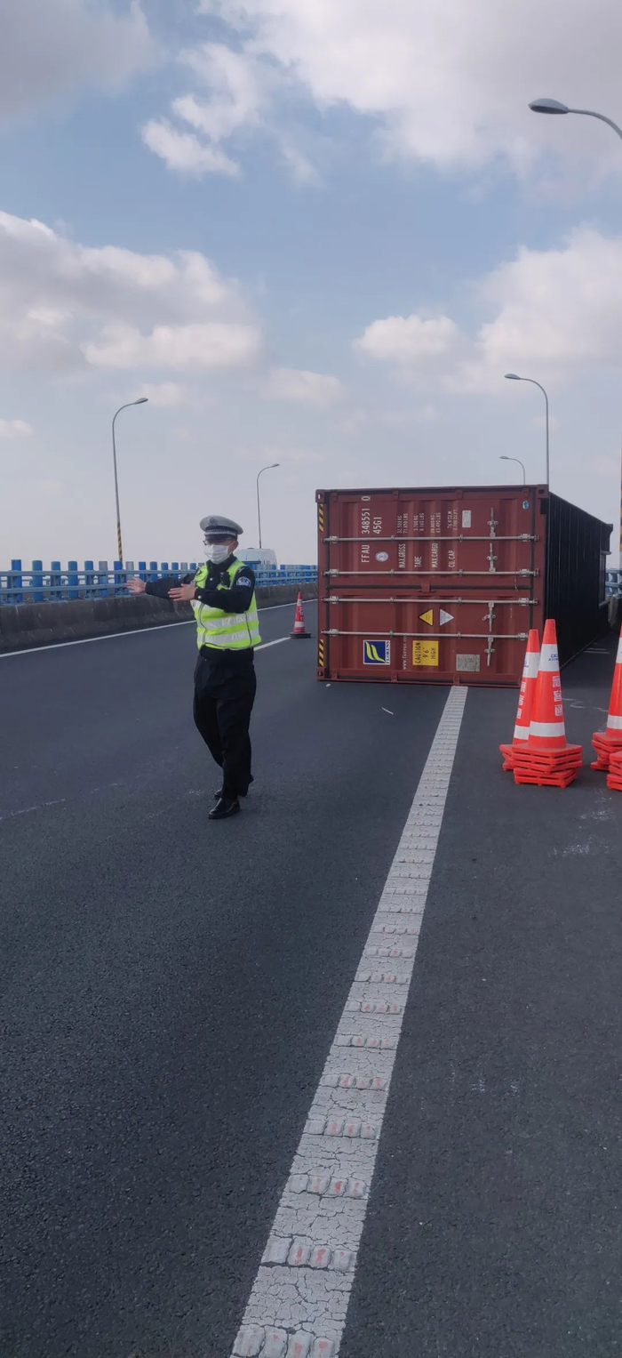 民警和联勤单位人员到达现场后,先合力将集装箱拖离超车道,打通一条车道,指挥后方车辆从超车道通行。又经过半个小时的努力,集装箱被移至应急车道,现场恢复通行。
