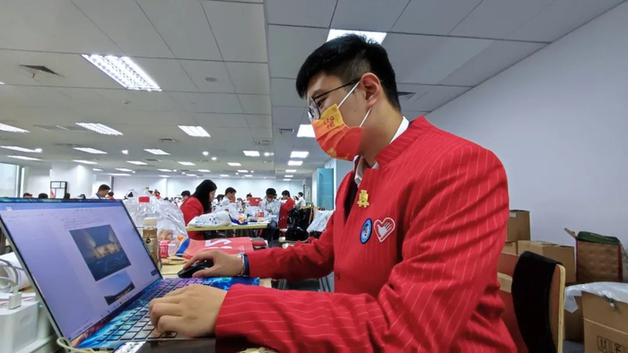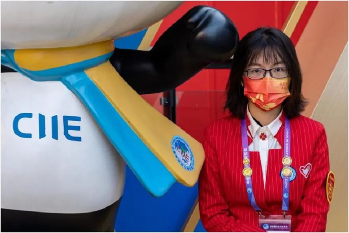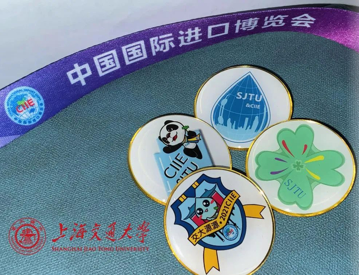 徽章主要由“红、绿、蓝”三种主题色构成。老红楼的正红色搭配医学院与进博会的缩写,共同诉说着赤诚热情;绿色的“四叶草”、头戴“进宝”帽子的医学生形象,让交医小叶子们在进博会会场成为最靓的仔,共同为城市增光添彩。