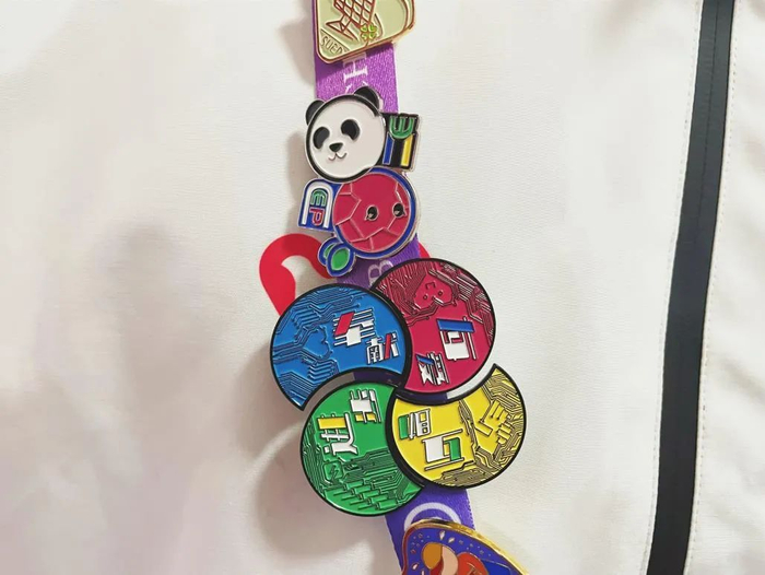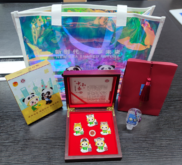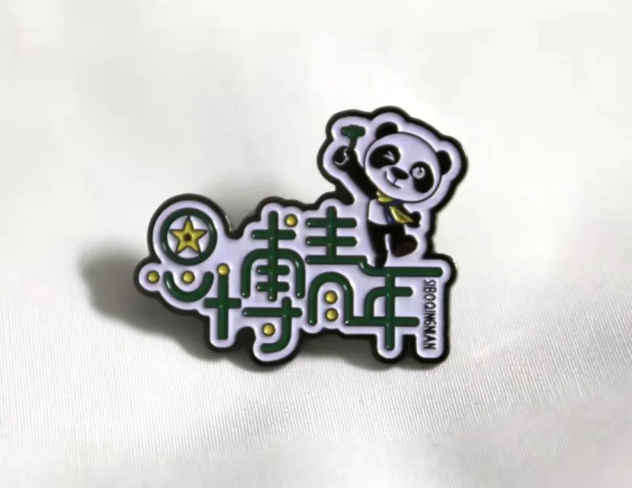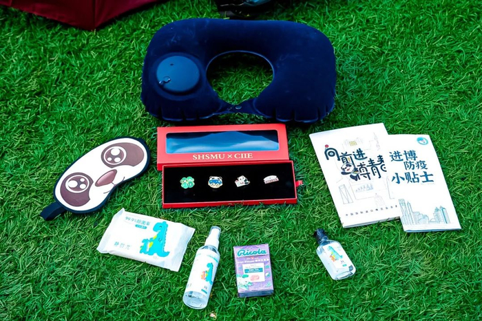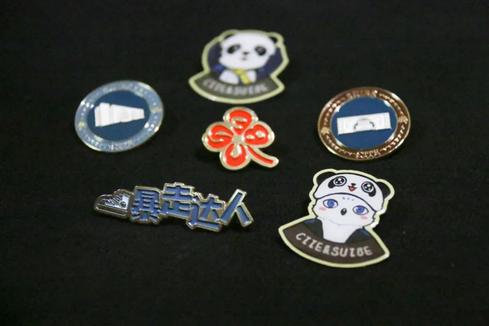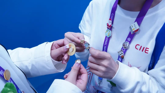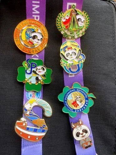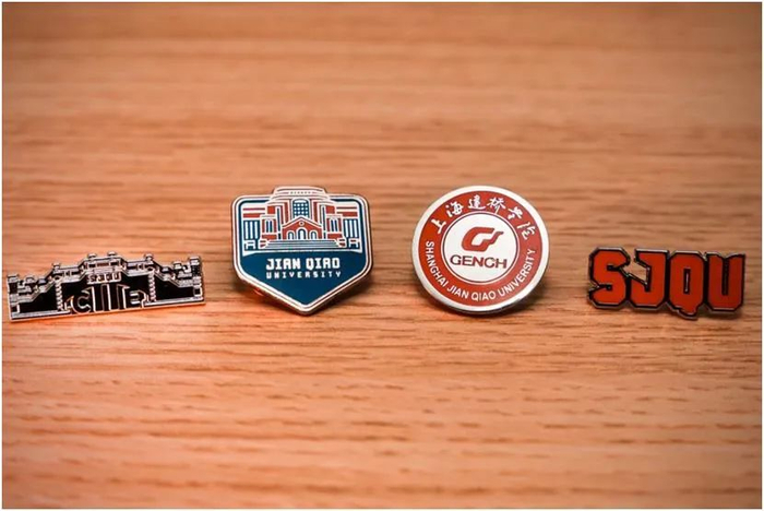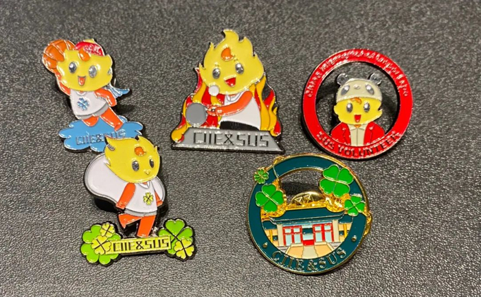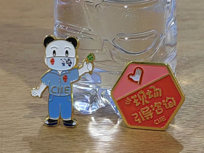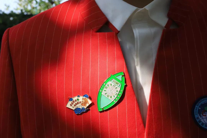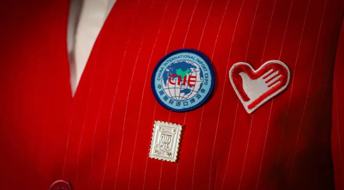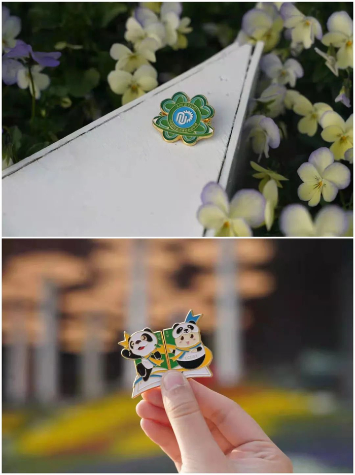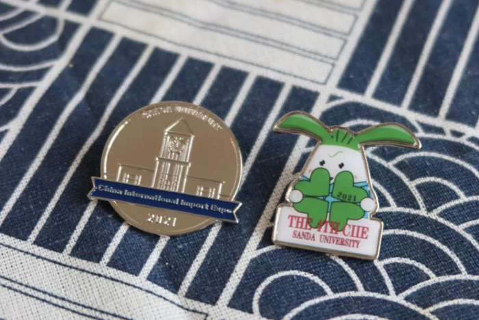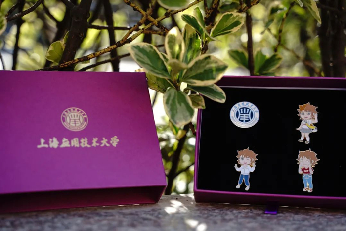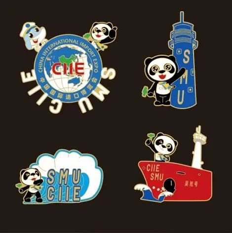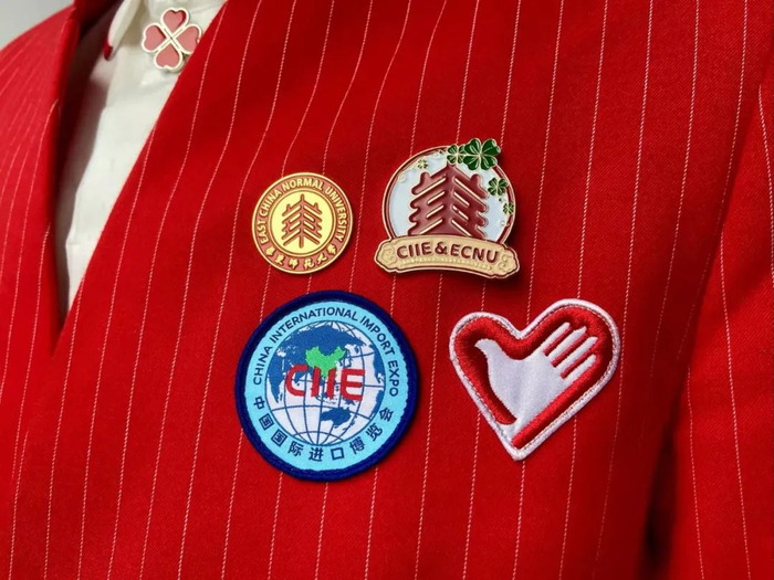 徽章一套6枚,是由学校“小叶子”们原创设计的,不仅与进博会元素联名,同时也有校园地标的联动。其中最具特色的是“四叶草”徽章,靓丽的红色四叶草,巧妙融入“SUIBE”的缩写,象征着SUIBE“小叶子”将与进博携手同行,共赴未来,徽章戴在胸口,开放互融永在心中。