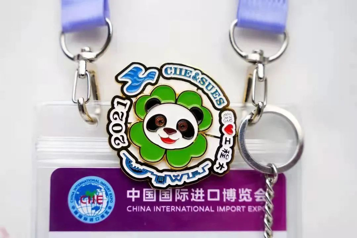 “四叶草”徽章将进博会场馆国家会展中心(上海)的形象与华理校徽元素有机融合,既代表了国家会展中心(上海)主体建筑的造型,又具有幸福和幸运的象征意义。“花梨进宝”徽章通过“双枚一体”的设计,将进博会吉祥物“进宝”和华理吉祥物“小花梨”形象结合在一起,两款徽章可拆分可合并,象征着进宝和花梨携手同行。