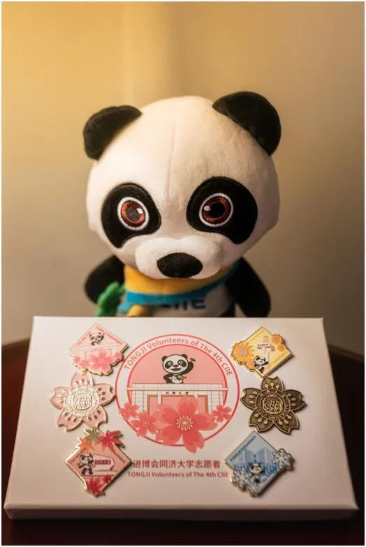 徽章共6枚,其中2枚为同济樱花徽章,其余4枚是以同济代表性地标为基础元素,分别是同济大学校门、国立柱、校名石和图书馆,与进博会的吉祥物“进宝”组合而成,不仅象征着同济志愿者的精神四季长青,年年庚续,同时,也彰显出“小叶子”们积极、活跃和青春靓丽的一面。