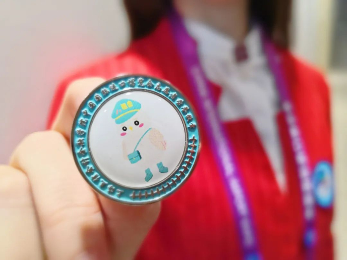 徽章采用圆形双圈设计理念,中间采用滴胶工艺,覆盖学校团委吉祥物“小信鸽”图案;外围一圈以烤漆工艺镂刻“上海立信会计金融学院中国国际进口博览会志愿者荣誉徽章”字样,整体设计简洁大气,凸显青春风采。