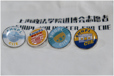 徽章共有4枚,由学校“小叶子”们原创设计,为黄白相间,蓝黄相间,蓝白相间,淡蓝与深青相间,象征着上政人无限的青春与活力。设计融入了校园地标性建筑,也象征着同学们对进博会活动的热情有增无减。