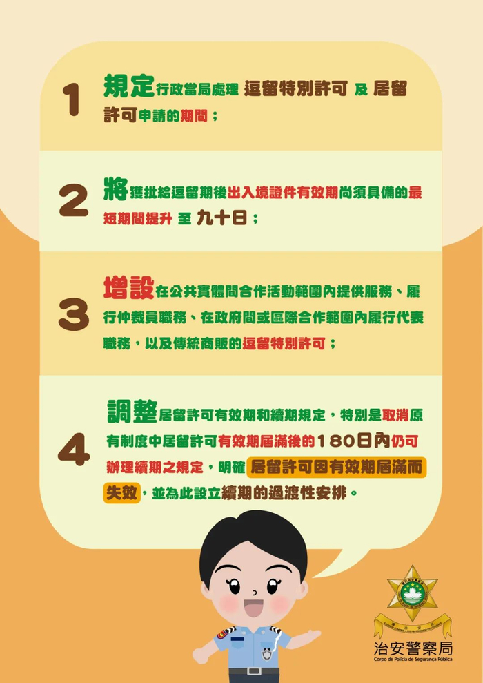 就新法的重点修改内容,以及出入境、逗留及居留方面的相关规范和行政手续,治安警察局将适时作进一步公布。请关注治安警察局网页、微信号等资讯平台的相关资讯发布及宣传。
