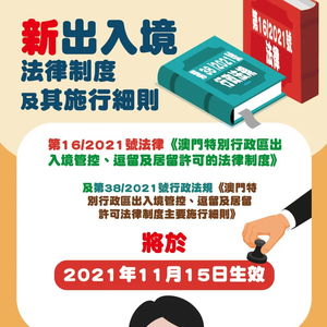第16/2021号法律《澳门特别行政区出入境管控、逗留及居留许可的法律制度》于2021年8月5日获立法会细则性审议通过,其后于8月16日公布。配合该法律而制定之第38/2021号行政法规《澳门特别行政区出入境管控、逗留及居留许可法律制度主要施行细则》于今(8)日公布。上述法律与行政法规,将于2021年11月15日同日生效。