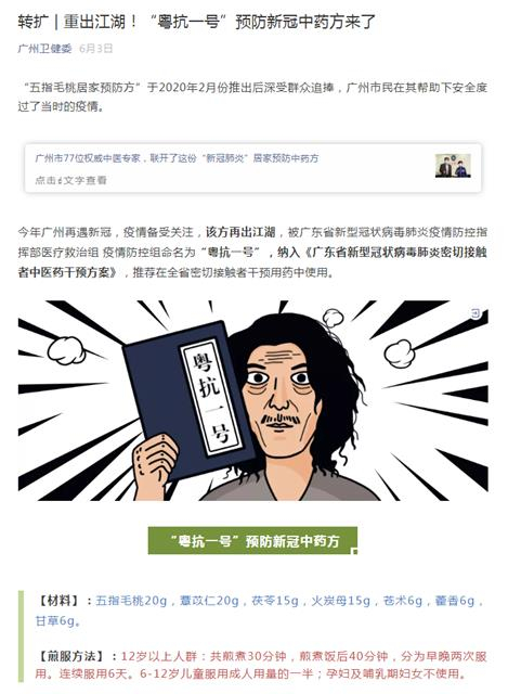 记者查询到,2020年6月3日和2020年2月8日,广州卫健委在其官方微信公众号上曾两次推荐“‘粤抗一号’预防新冠中药方”,材料包括:五指毛桃20g,薏苡仁20g,茯苓15g,火炭母15g,苍术6g,藿香6g,甘草6g。该方由广州市卫生健康委组织77位来自温病学、中医肺病、中医危急重症、中药学等领域的中医药专家,组建的市新型冠状病毒感染的肺炎中医药防控专家组联合开具。2020年6月3日,广州卫健委发文称,经过一年的实践证明,该方适用于岭南地域气候特点、广东人群体质和本地病例临床特点,因此“粤抗一号”被再次推出,并应用于密切接触者干预。