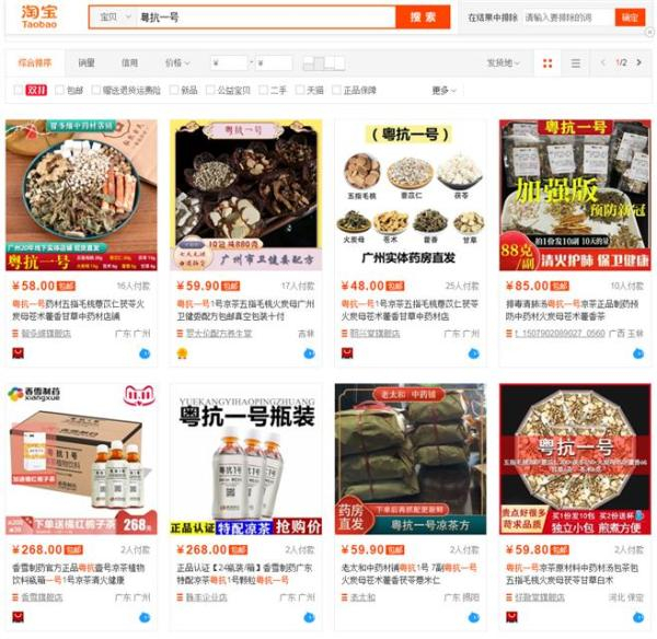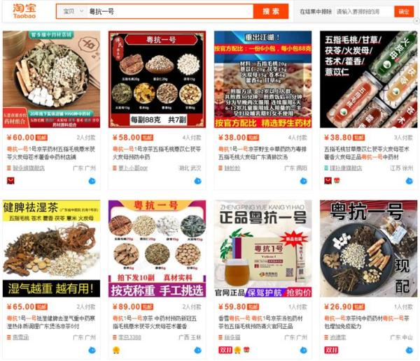 此后,在电商平台上出现了所谓“粤抗一号”凉茶、“粤抗一号”汤包、“粤抗一号”药酒等。对此,广东省多地对相关行为进行查处。例如,广东顺德多次开展“粤抗1号”凉茶排查行动。