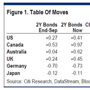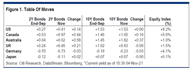 伴随着央行政策改变,短期国债利率也剧烈波动:加拿大、澳大利亚、美国和英国两年期政府债券的收益率在过去一个月里大幅上升;利率市场定价则开始反映加息的预期。