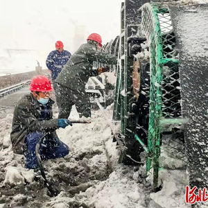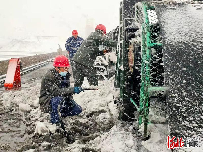 11月7日,黄骅港务公司工作人员正冒暴风雪紧急处理煤炭传输皮带机积雪,保障安全运煤。黄骅港务公司供图