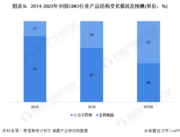 医药行业产品主要分为生物药(大分子药)和化学药(小分子药),根据Frost&Sullivan的数据,中国CMO业务中,生物制品的比例将会超过小分子药物的占比,从2018年的33%上升到2023年的52%。