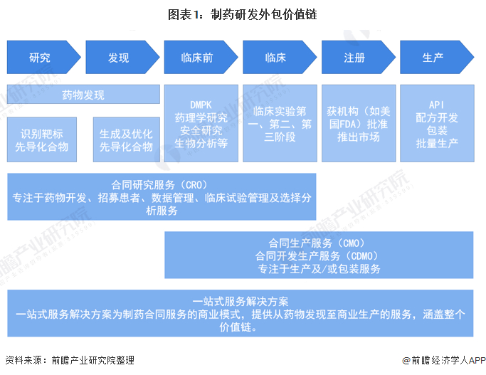 制药研发外包可分为两类:合同研究服务(CRO)及合同生产服务╱合同开发生产服务(CMO/CDMO)。一站式服务提供从药物发现到商业制造的服务,涵盖整个制药价值链。其中,合同研究服务(CRO)是指通过合同形式为医药企业在药物研发过程中提供专业化外包服务的组织或机构;CRO企业接受药企的委托,执行新药研究中的部分工作。