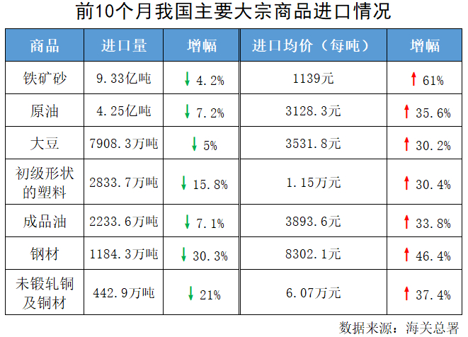 根据海关总署统计,今年前10个月,部分大宗商品进口量减价扬,铁矿砂、原油、大豆、铜……无一不是如此。