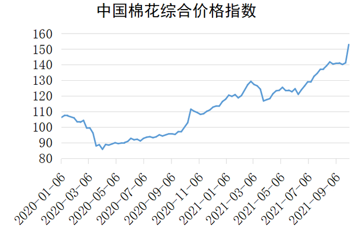 中国棉花综合价格指数从去年4月的85.82一直震荡攀升至今年10月的152.95。