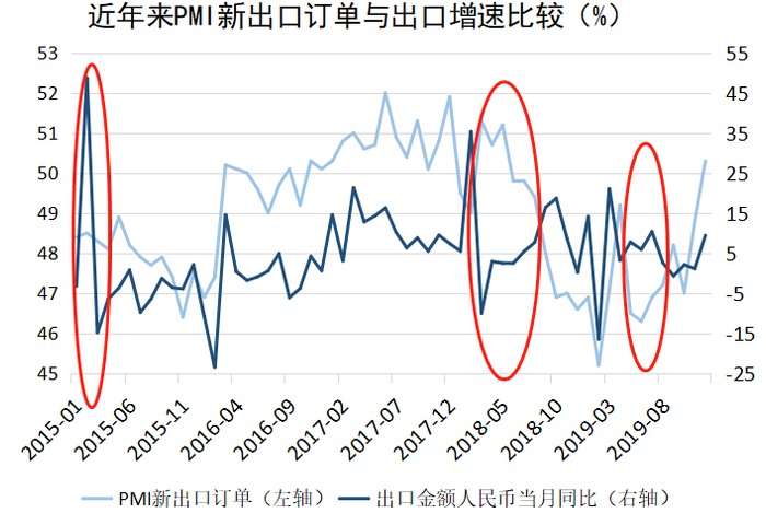 2019年4月至7月,PMI新出口订单指数从49.2%下跌至46.9%,对应的出口增速则从3.22%逐步攀升至10.39%。