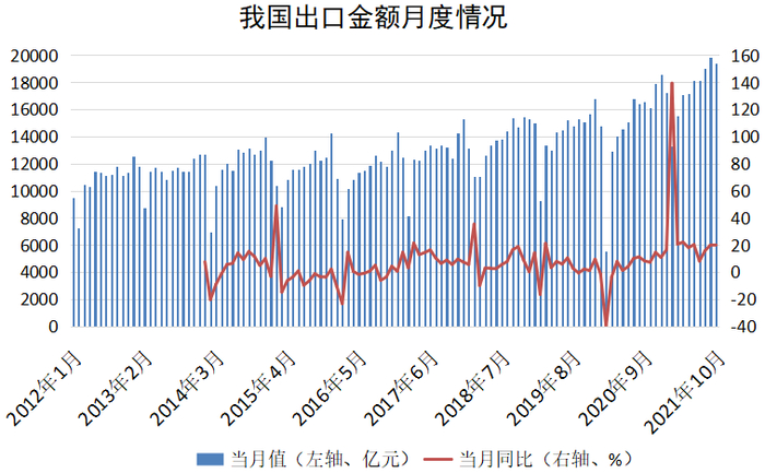 今年以来,在海外疫情持续、主要经济指标存在下行压力的背景下,外贸却成了中国经济稳步复苏亮丽的“风景线”。尤其下半年以来,海运价格高企、原材料价格持续攀升并没有影响到外贸出口基本盘,8月、9月、10月连续三个月出口大幅超预期。中国外贸的韧性和产业链的优势得到充分凸显。