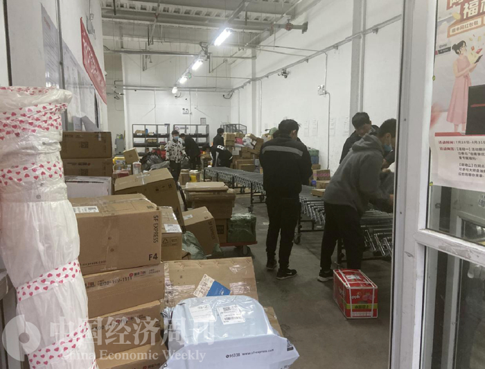 记者探访北京某快递网点,内部快件大量堆积。摄影:《中国经济周刊》记者 张宇轩