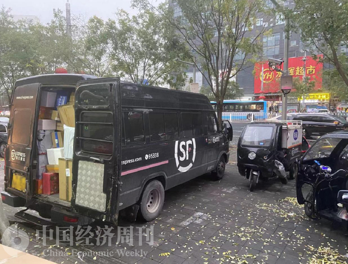 11月6日,北京丰台区某快递网点,等待卸货的快递货车与等待派件的快递三轮车。摄影:《中国经济周刊》记者 张宇轩