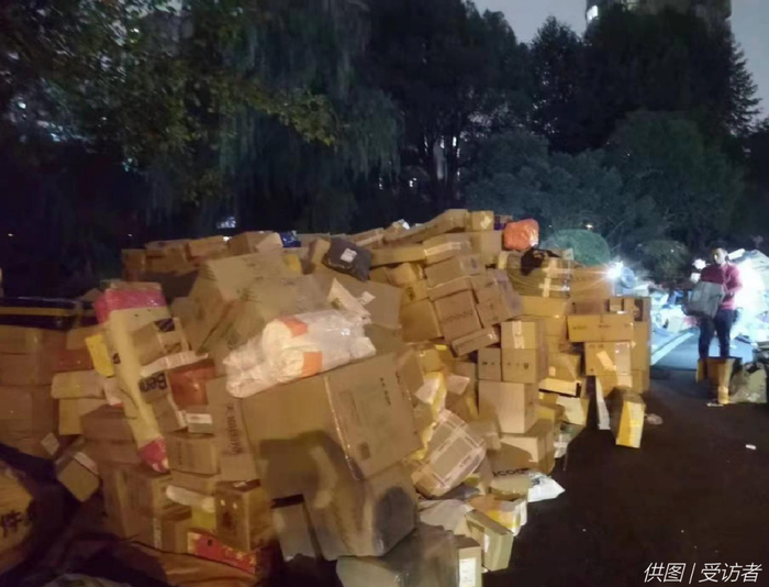 记者走访该区域快递取件点发现,包括顺丰在内,圆通、申通、邮政等多家快递的快递员都集中在该区域的马路边,各自车上的百余件快件被堆放在空地上,形成一个个由快件纸箱形成的小山。