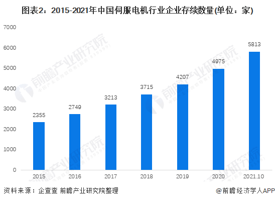 电机及智能驱控系统作为电能转换为动能的核心部件,在智能家居、办公自动化、安防监控、机器人、电子制造设备、工业自动化、医疗器械、航空航天、军工等各领域得到了广泛的应用,随着我国各行业的不断发展,我国伺服电机行业的企业数量也在不断增加。2020年末,我国伺服电机行业内处于“存续”状态的企业数量为4975家,而截至2021年10月15日,这一数字上升至5813家。