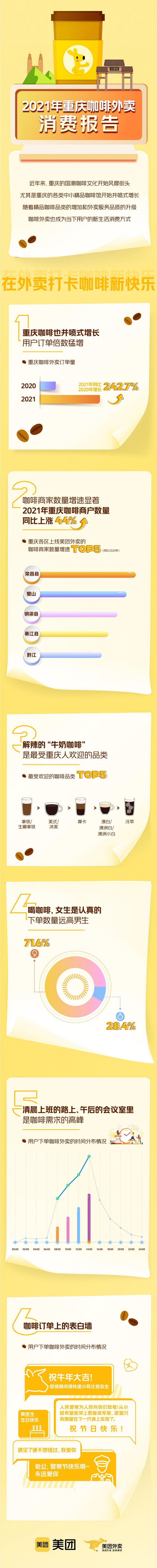 近日,美团外卖发布了《2021年重庆咖啡外卖消费报告》(以下简称《报告》),《报告》显示,过去的一年,重庆咖啡外卖呈现井喷式增长,订单增长了242.7%。2021年重庆咖啡商户数量同比增长近44%,而年轻人最爱的,还是拿铁。
