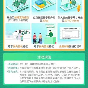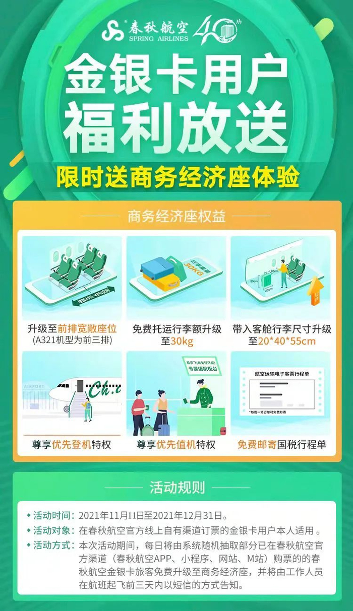 春秋航空金银卡会员购买航班日期为2021年11月11日至2021年12月31日,且航班由春秋航空实际承运,即有机会获得免费升级至商务经济座的机会。值得注意的是,该权益仅限金银卡会员本人乘机时使用。