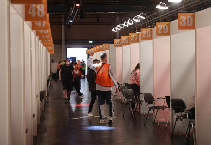 2021年8月9日,德国柏林,当地民众在柏林Arena Treptow疫苗接种中心,边听音乐边等待接种新冠疫苗。