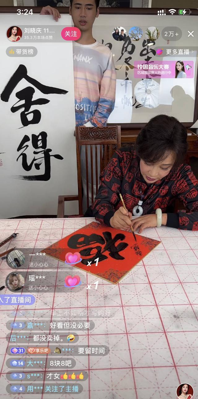 直播过程中,刘晓庆主要负责挥毫,身后则站着两位男助理拿着作品负责展示,另外还有一位直播主持人随时提醒刘晓庆商品销量,催促她赶紧写。而就刘晓庆直播间销售情况来看,买账的网友不少。从截图来看,售价888元的“福”字已卖出213幅,9999元的大幅“舍得”也卖出了16份。