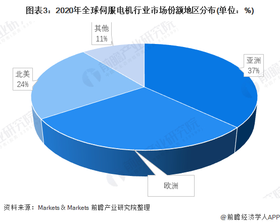 从全球市场来看,德国、日本、意大利、美国是伺服电机应用份额最大的几个国家,伺服电机市场形成了欧洲、北美、亚洲三足鼎立的态势。亚太伺服电机需求占全球需求总量的37%;北美市场占比为24%;欧洲地区市场占比为28%。
