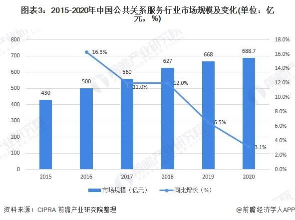 据中国国际公共关系协会CIPRA调查显示,2020年整个市场的年营业规模约为688.7亿元人民币,年营业额增长率为3.1%,略高于全年GDP2.3%的增幅,利润增长率为1.2%。受疫情和整体经济形势的影响,行业收入与上一年度相比,增幅有较大的回落。