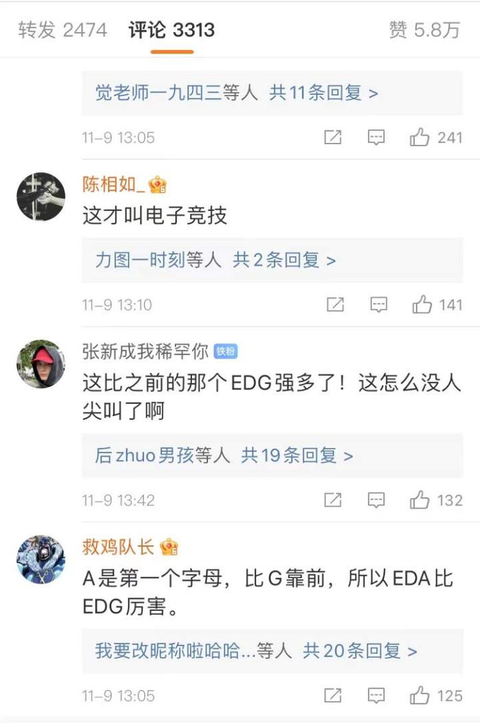 因为有EDG夺冠的粉丝狂欢和刷屏在前,EDA夺冠引发了网友的对比评论:“带ED的就是牛”“这才叫电子竞技”“A是第一个字母,比G靠前,所以EDA比EDG厉害”……