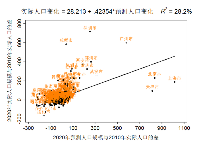 首先,我们将各城市2020年实际人口规模和预测人口规模分别与该市2010年的人口规模相减,得到十年间实际发生的人口变动情况和预测的人口变动情况,并画散点图: