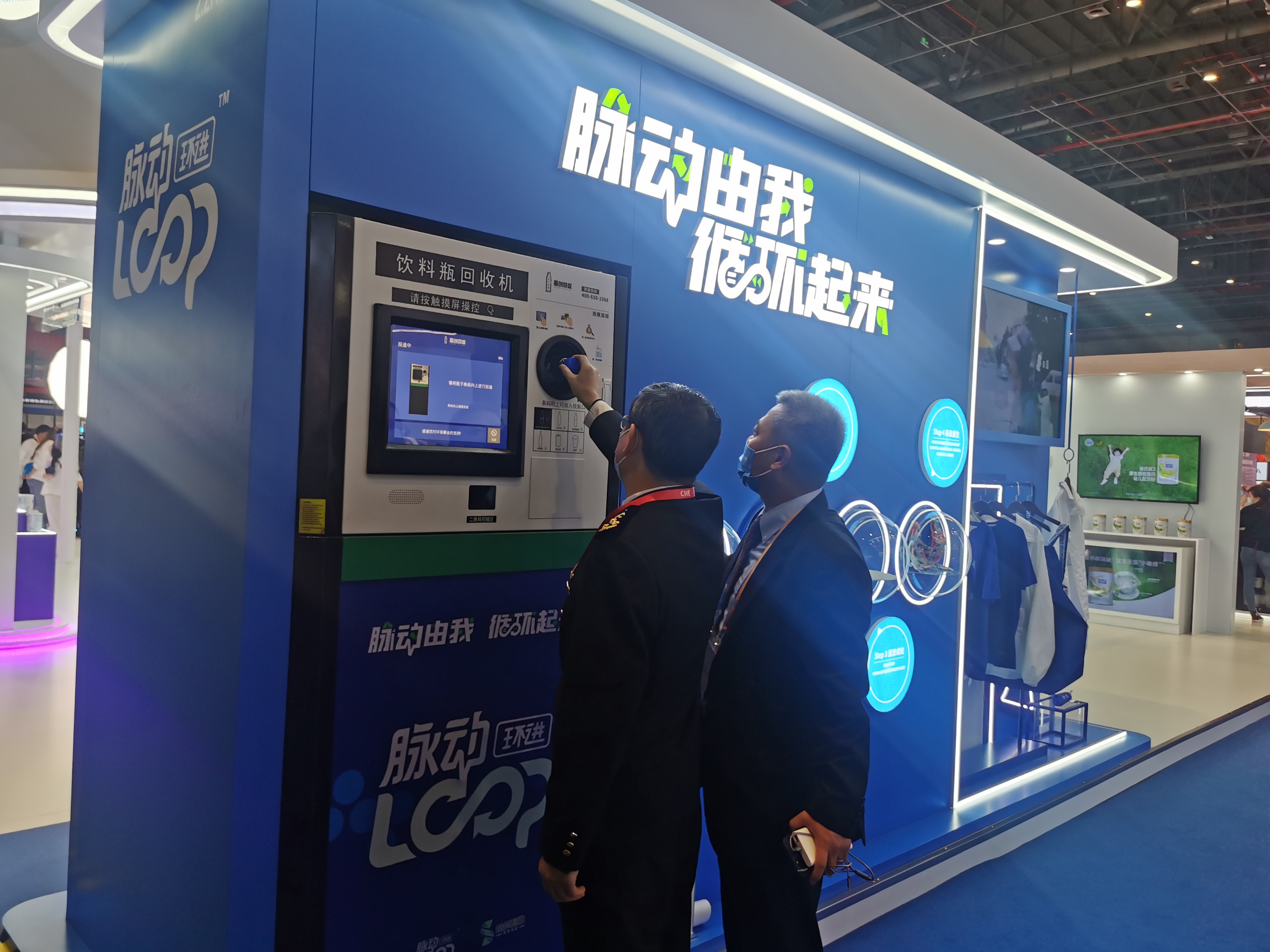 第四届进博会期间,法国乳业巨头达能首次将“智能塑料瓶回收机”搬到了现场,通过收集塑料饮料空瓶并回收利用,传递绿色减碳理念。16个饮料瓶经切割、清洗、重塑成粒、再造重生等系列操作后,最终变身成为一件外套。