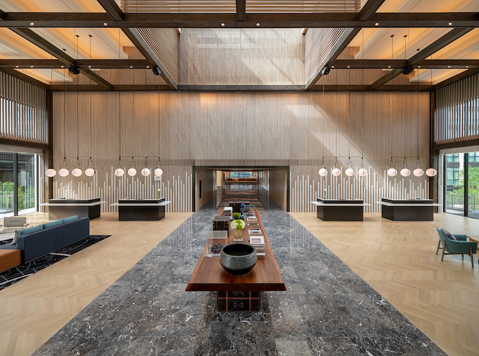 绵阳首开喜来登酒店的大堂被赋予“开放式共享空间”的定位,完整且开放的空间可供旅客社交或独处。酒店融合了多种喜来登品牌焕新的元素:共享长桌兼具形式与功能,内置照明、插座和无线充电等设施,可满足旅客专心工作或享受美食的不同需求;工作室提供灵活的聚会空间,在此举行小型会议或私人用餐两相宜;电话亭可供旅客在此进行私密畅快的交流。