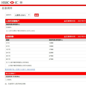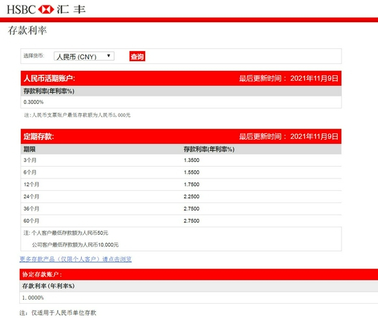 中新经纬在汇丰中国官网看到,11月9日该行公布的定期存款3个月、6个月、1年、2年、3年的存款年利率分别为1.35%、1.55%、1.75%、2.25%和2.75%。