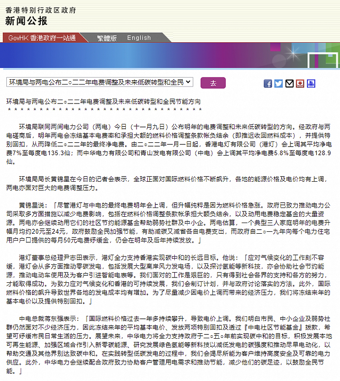 11月9日,香港特区政府网发布新闻公报称,香港环境局联同两间电力公司(下称两电)今日公布明年的电费调整和未来低碳转型的方向2022年1月1日起,香港电灯有限公司(下称港灯)会上调其平均净电费7%至每度电135.3仙;而中华电力有限公司和青山发电有限公司(下称中电)会上调其平均净电费5.8%至每度电128.9仙。