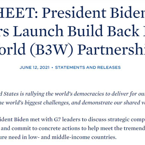 当时的白宫声明指出,通过B3W,G7成员国和其他“有相同想法”的伙伴将展开合作,动员私有资本在四个主要领域投资:气候、健康和健康安全、数字技术、性别平等和公平。