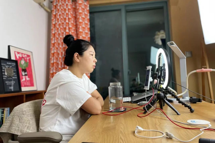 王慧玲的直播间是出租屋二楼的一间卧室改造而来的。书桌前立着两架补光灯,靠墙的置物柜上摆放着B站10万粉丝的奖牌、日语N1证书、自己画的插画,还有她最近出版的新书《基层女性》。王慧玲的椅子旁总放着一大桶矿泉水,直播时,她讲话密而急,一激动就提高嗓门,“要独立!”“靠自己!”声音在一楼也能听清。