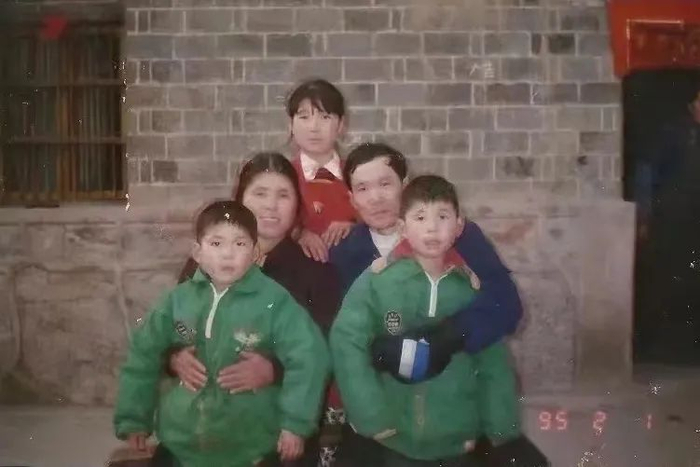 王慧玲小时候的全家福,穿绿衣服的是两个弟弟,穿红衣服的是她